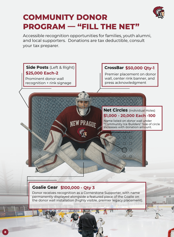 New Prague Hockey Arena is a nonprofit corporation organized under Section 501(c)(3) of the Internal Revenue Code. Contributions are tax-deductible to the extent permitted by law.