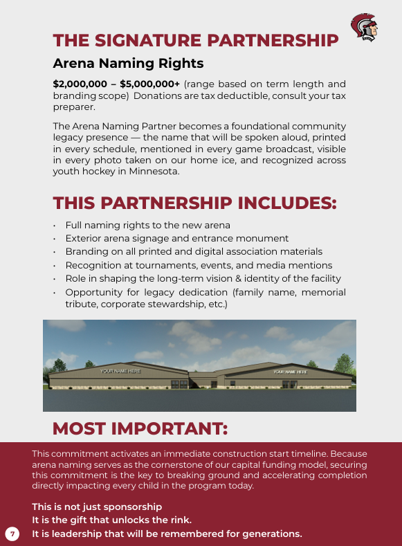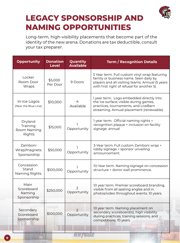 We are looking to partner with families, local legacy names, community-driven companies, and organizations who believe in youth development, community connection, and the long-term future of New Prague. This is a chance to do something lasting. Something visible. Something meaningful.